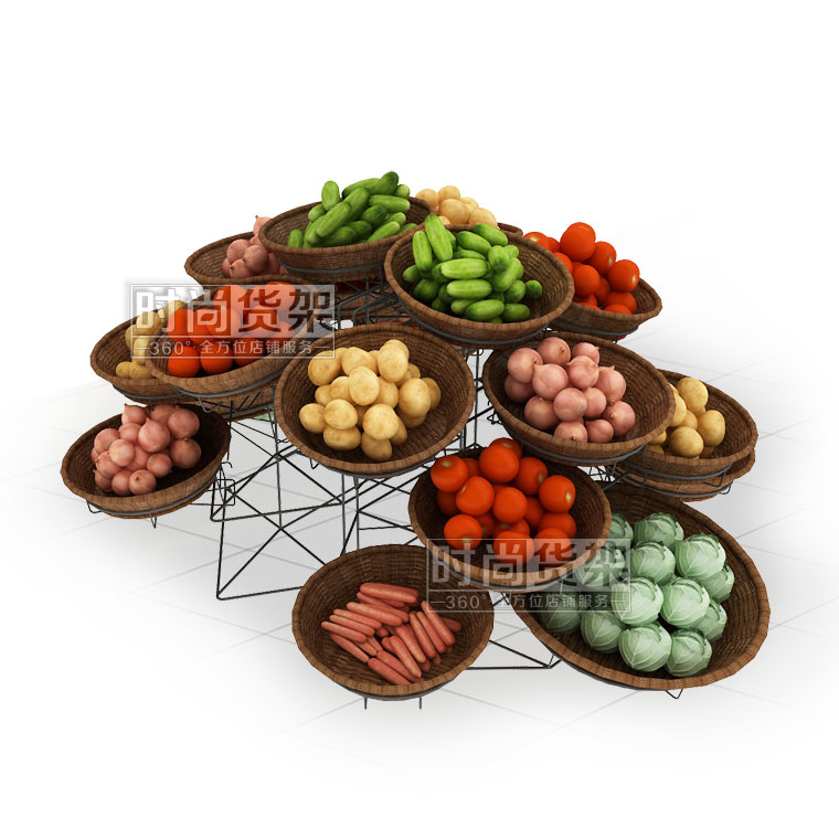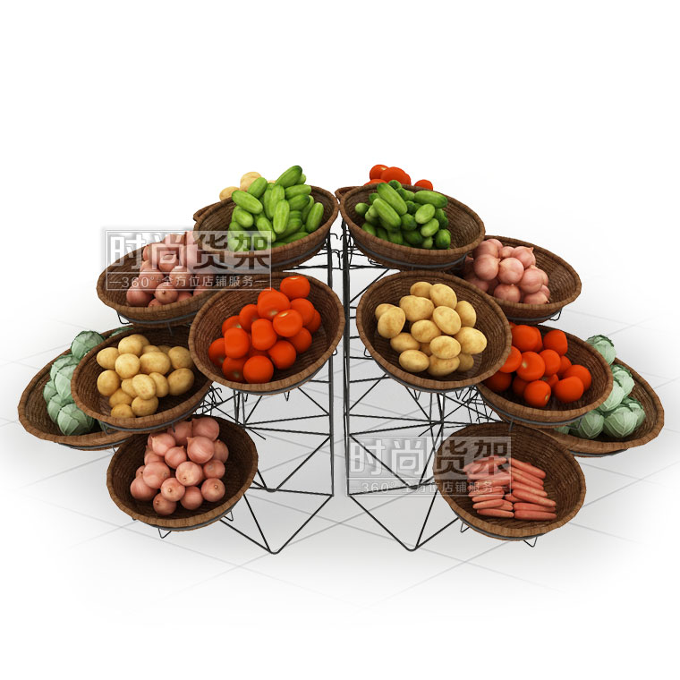 【特點】 生鮮商品不適宜直接陳列在常規的超市貨架上,這款生鮮區專用的堆頭架就成了最好的選擇。上下錯落的藤筐讓果蔬商品變換多種方式陳列,展示更加充分,更利于激發消費者強烈的購物欲望。