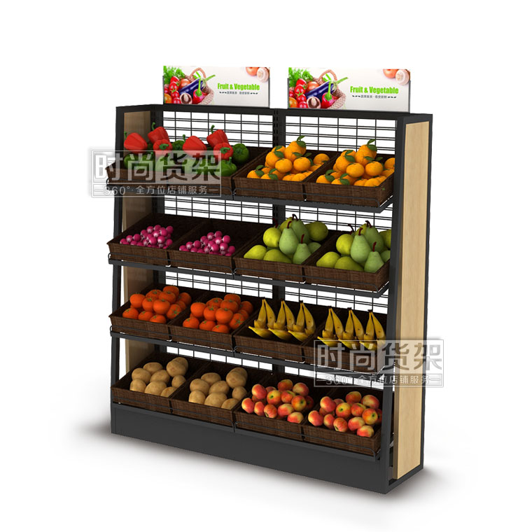 【描述】這款超市單面果蔬展示架采用了通透性更強的網背板設計,優質冷軋鋼精制而成的整體框架、高檔環保木板打造而成的側板,用料的優良讓這款果蔬架由內而外散發出時尚、高端的氣質,是超市生鮮區內絕佳的商品展示道具。