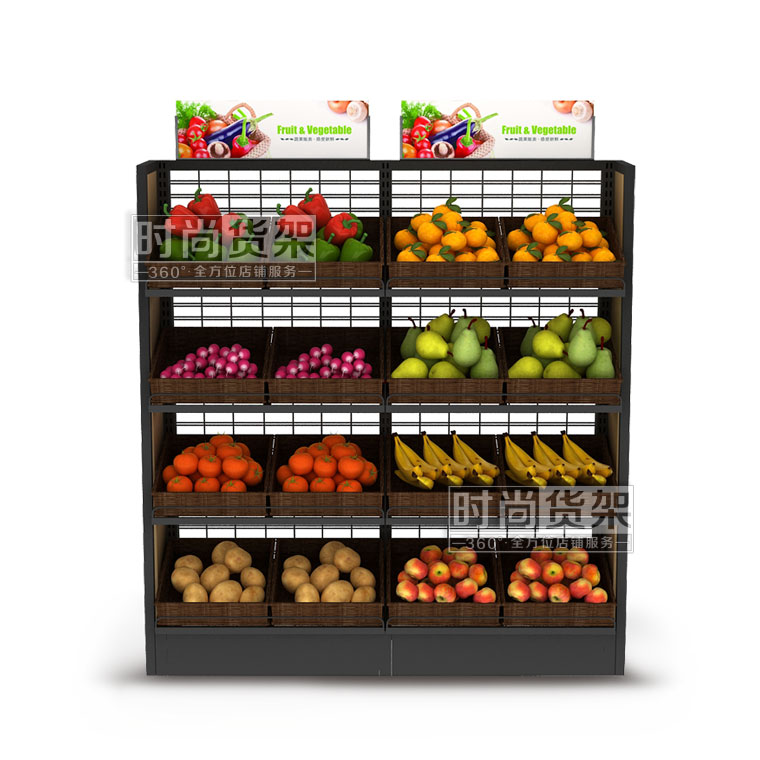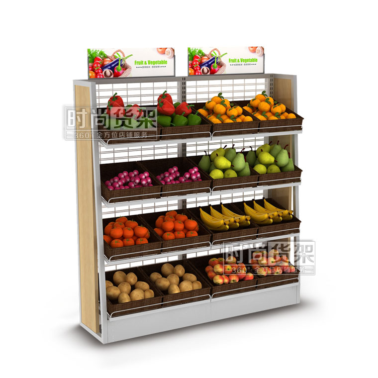 【特點】單面式的結構設計讓果蔬架更適宜擺放在靠墻位置,頂端自由配置的廣告牌更增添了商品分類指引的作用,為顧客選購所需商品提供便利。